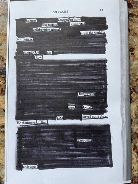 My Blackout Poem comes from the pg. 131 in the book, On Trails by Robert Moor. It was highly recommended by a friend but I am struggling with getting through it. It is interesting to me but I can only read so many pages of science before needing a break. I decided to take the current page I was on and look at it in a new way by turning it into poetry.