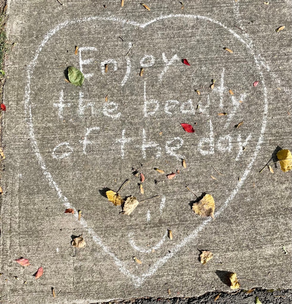 Did you ever just feel like heaven is trying to reach you? I was struggling emotionally for a few days. So when I noticed sunshine out the window, I forced myself to get up and go for a walk . Within my first few steps on the trail, I walked by the chalked message above. That message felt like it was written just for me! I needed the reminder to stay present and enjoy the beauty of this day. This day certainly had a wealth of beauty to offer – sunshine, blue sky, puffy white cotton ball clouds, warm breezes, and the colors of fall beginning to pop. Truly a day filled of delight!