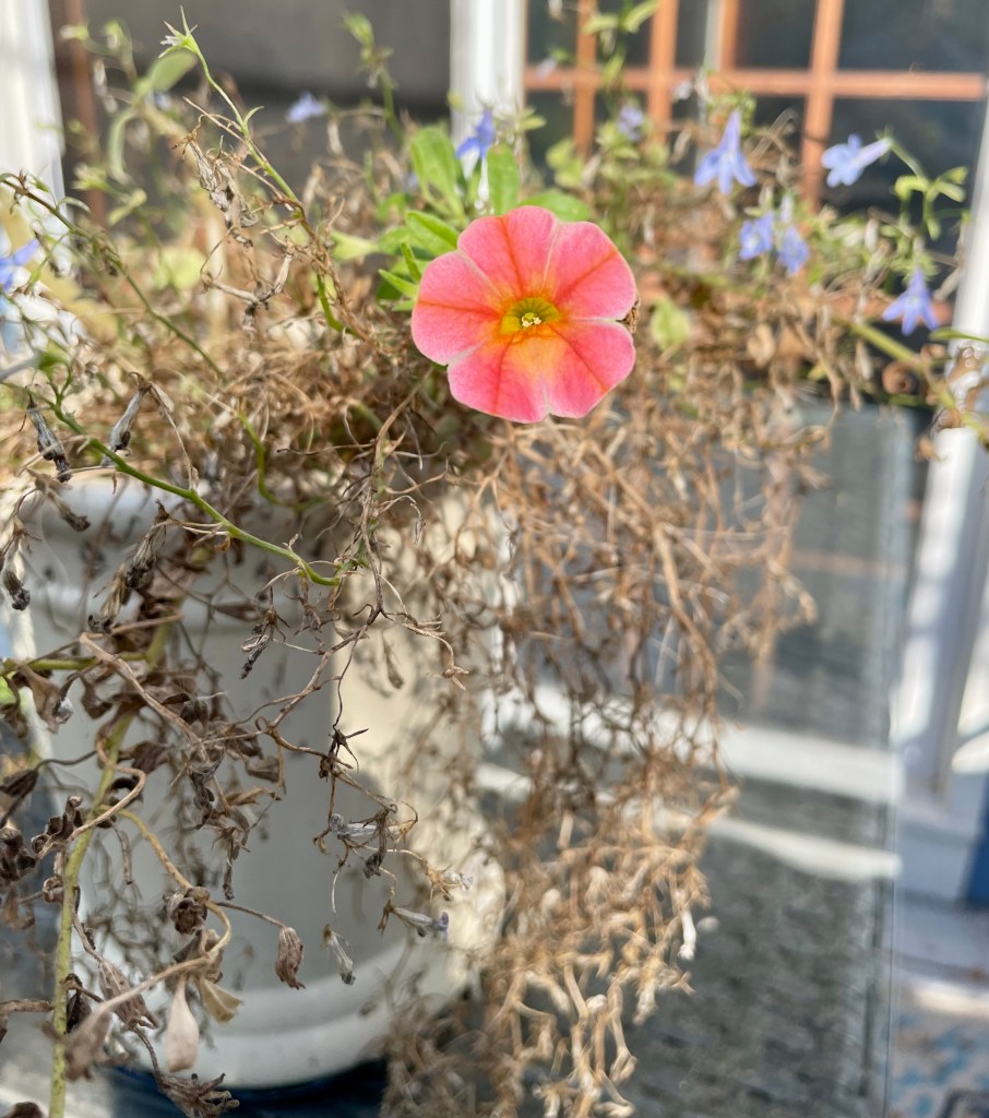 Such beauty! Yes, a powerful reminder of the will to live despite all circumstances indeed. This looks like a petunia. I have some lantana that is up to the same tricks, and I can’t bear to clip the stems. I am tempted to bring the last of the colorful blooms indoors. Then there are the azaleas around back – – the bush is still loaded. I suppose we’d better enjoy this while we can.