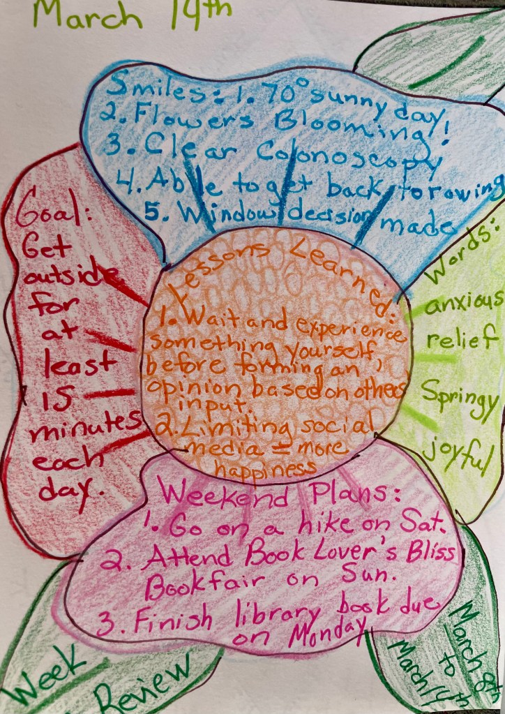 Each week I complete this reflection. Some weeks are just writing across the page and other weeks get colorful with more of an artistic flair. This week with Spring weather and flowers blooming it felt right to capture this switch in my reflection.